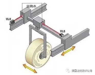 安装:使用两台ULS(上图)激光测距传感器面对起重机的两个轨道进行定位(下图),一个单元前后运动,另一个单元左右运动。通过软件实时监测测量距离数据,从而判断进行保障及提高起重机的安全性。
