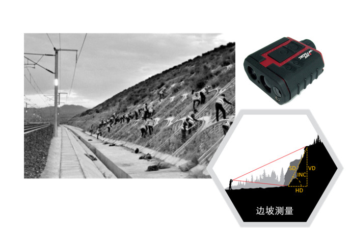 使用图柏斯TruPulse200X跨距测量(ML)功能可以轻松、快速地测量铁路沿线边坡的倾斜率(INC)、高差(VD)等数据,为边坡治理和养护提供可靠的测量数据。
