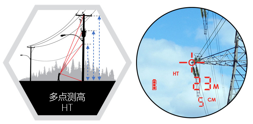 图柏斯200X三点测高功能(HT)能快速准确地获取线杆及同一杆塔上多个设备的高度值, 不受天气、陡峭地形或难以接近等因素影响, 提高工作效率和安全系数。