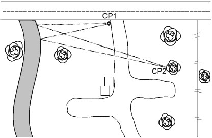 适用于类似考古发掘或其它站点地图等较小的项目。首先,选择两目标作为控制点,然后站在每一特征点上分别向这两个控制点打点就能轻松获得它的位置。